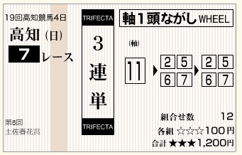今年の高知競馬における3歳世代は、黒潮ジュニアチャンピオンシップを制したヴァリヤンツリと、金の鞍賞を制したネオプリンセスの「2強対決」ではないでしょうか。但し、今回は今月に一度使われたヴァリヤンツリの方を上と見るべきでしょう。ネオプリンセスは金の鞍賞以来のレースですので、割り引いて考えた方がいいでしょう。ヴァリヤンツリから「例の手法」の残る4頭に流します。